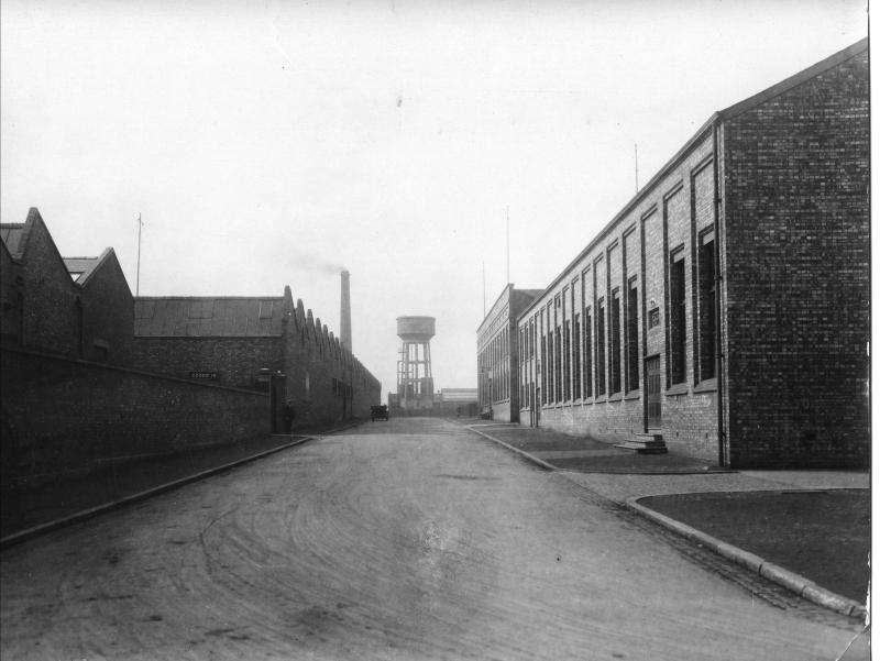 Captioned: Peel Connor Telephone Works, Telephone Road looking South. The Cabinet Works, Loading Yard & Main Factory are on the left, the Canteen/Ballroom, General Offices and Ebonite Works on the Right.