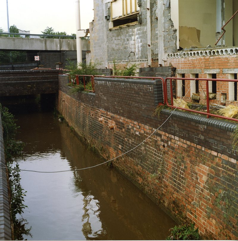 The Spon Street works during its demolition in the early 1990s, with the River Sherbourne running through the site.